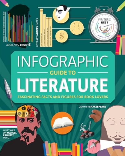 What are infographics? Simply put, they present statistical information in a visual format, turning boring details into colorful, entertaining scenes that help you remember what you have learned. Infographic Guide to Literature uses these fun, dynamic diagrams to show how much time great authors spend writing versus sleeping, which futuristic inventions became reality long after appearing in a novel, and why so many covers in genre fiction look the same. Along with these colorful and entertaining visual representations of statistics are quizzes that challenge you to identify popular authors from throughout history, as well as maps that chart some of the most iconic journeys in literature.